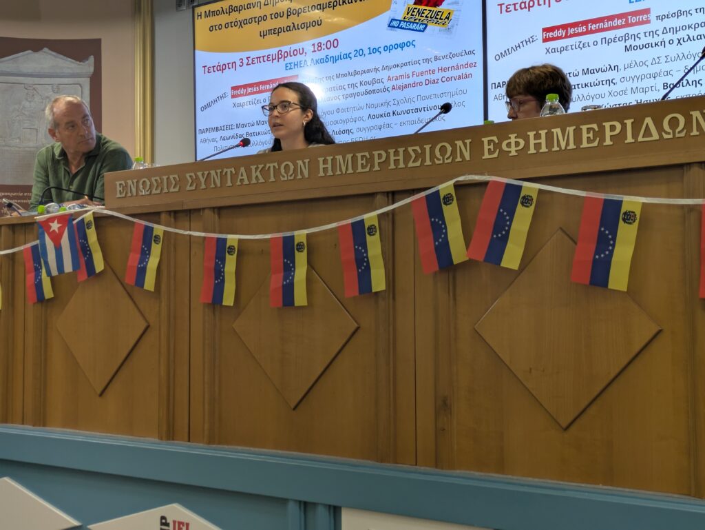 Η Λουκία Κωνσταντίνου, μέλος του Συλλόγου Χοσέ Μαρτί, μίλησε για την πρωταγωνιστική συμμετοχή των λαϊκών στρωμάτων και της νεολαίας στη Μπολιβαριανή Επανάσταση, μέσω των θεσμοθετημένων κοινοτικών συμβουλίων και κοινοτικών προγραμμάτων, στο πλαίσιο μιας «συμμετοχικής και πρωταγωνιστικής άσκησης της λαϊκής εξουσίας». Όπως τόνισε τις κατακτήσεις αυτές είναι που υπερασπίζεται ο λαός της Βενεζουέλας, καθώς και την περηφάνια του και το δικαίωμά του να ορίζει ο ίδιος την τύχη του, όπως κάνει επίσης ο λαός της Κούβας. «Είναι δύο χώρες του Παγκόσμιου Νότου που επί δεκαετίες βρίσκονται στο στόχαστρο του ιμπεριαλισμού των ΗΠΑ» σημειώνει, λέγοντας πως τα «γεράκια» των ΗΠΑ «έχουν δηλώσει πως στη τωρινή θητεία του Τραμπ θα τελειώσουν με αυτές τις χώρες», καθώς «είναι άρρηκτα δεμένες στον κοινό αγώνα ενάντια στον ιμπεριαλισμό, παίρνοντας άπειρες πρωτοβουλίες για την ενότητα της Λατινικής Αμερικής».